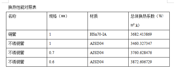 在壁厚相同的情況下,不銹鋼管的總體傳熱系數(shù)比銅管低6%。由于使用比銅管薄的不銹鋼管,不銹鋼管的總體傳熱系數(shù)和凝結(jié)放熱系數(shù)都比銅管大,使不銹鋼管的總體傳熱系數(shù)得到提高。